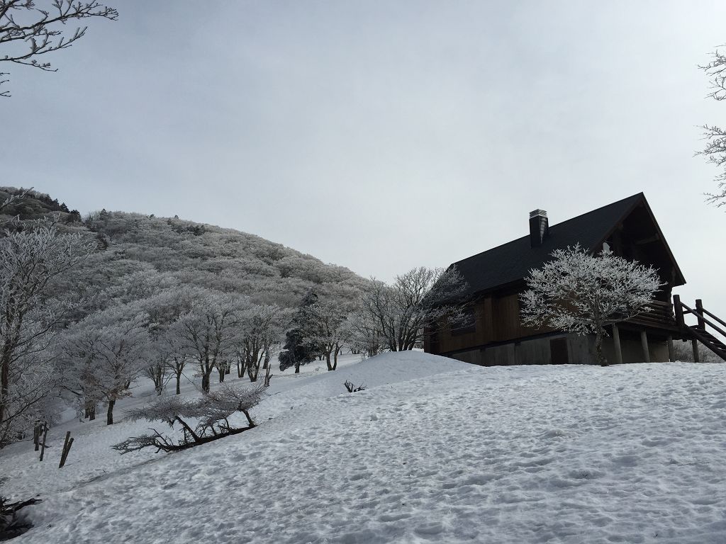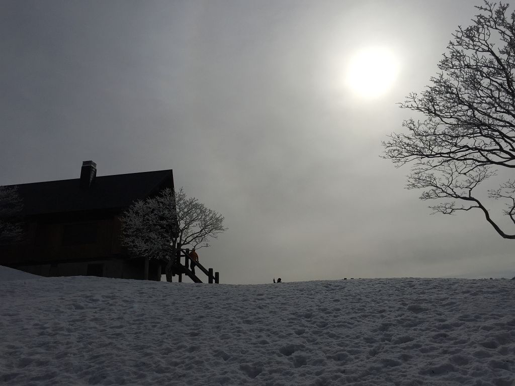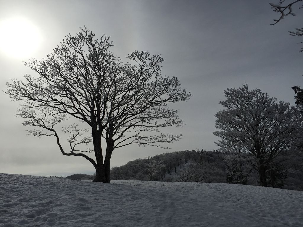 曇りの明神平では霧氷と陽の光の幻想的な光景がみられる
