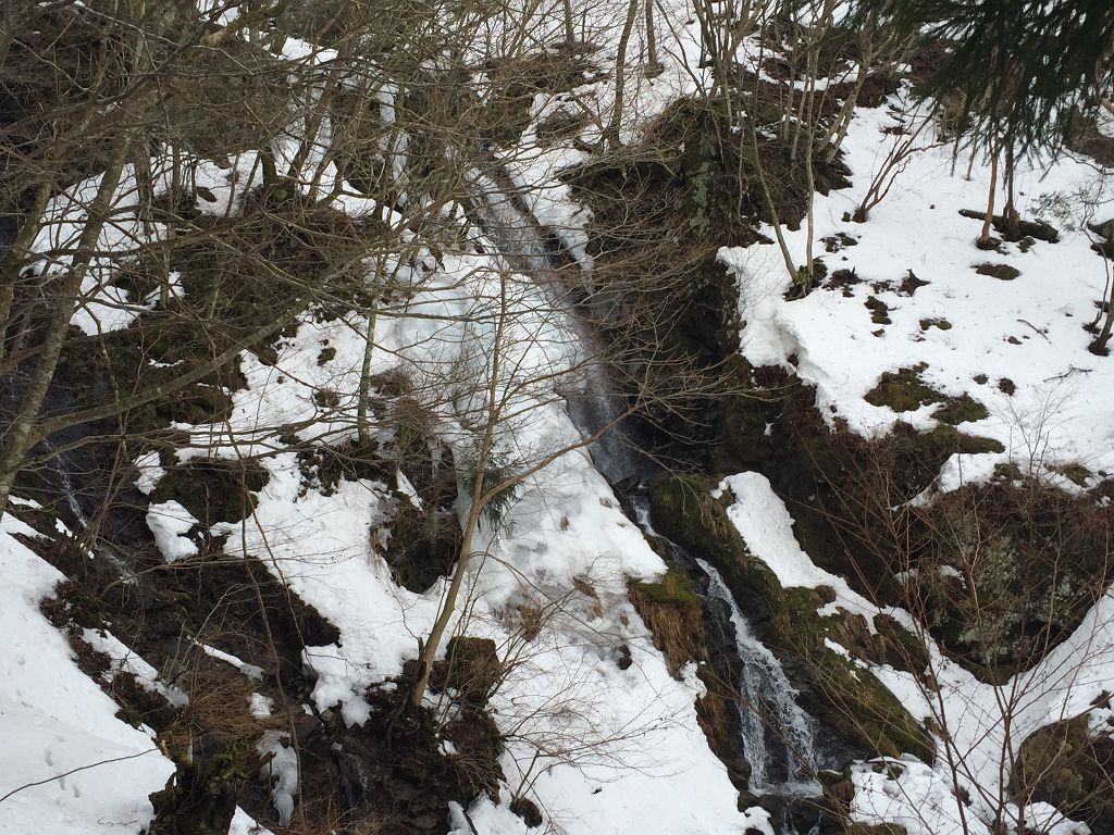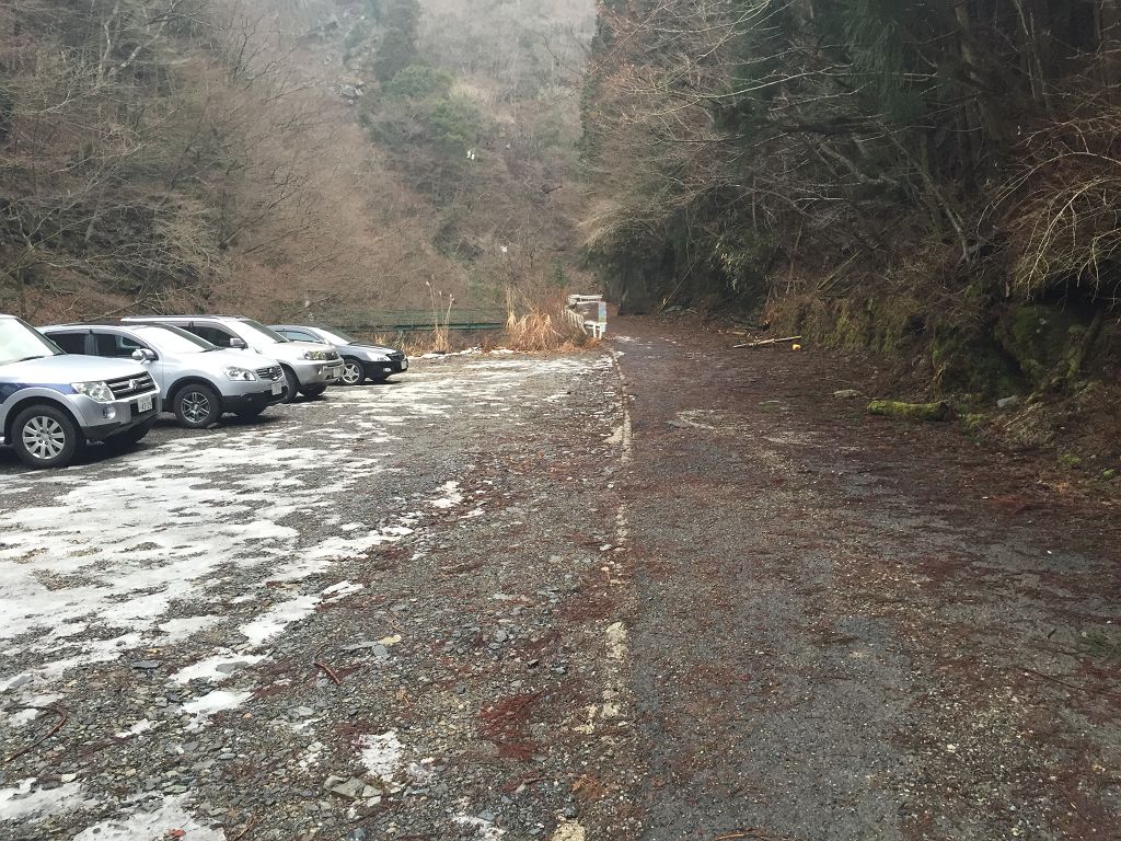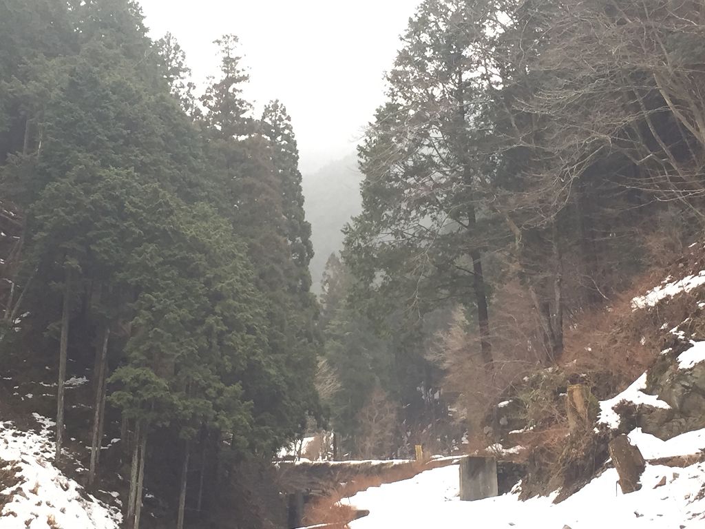 林道にはまだ雪が残っていた。朝方なのか結構パリパリ