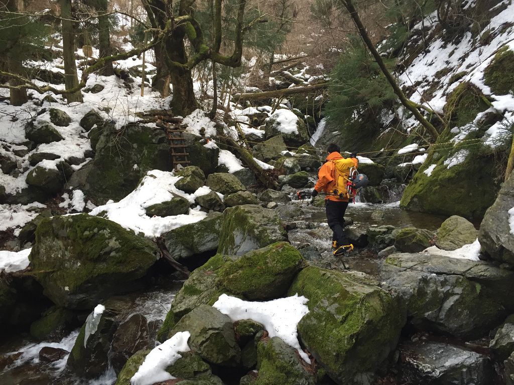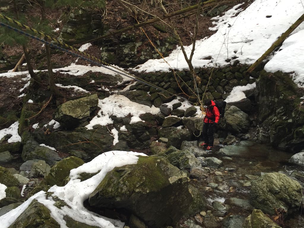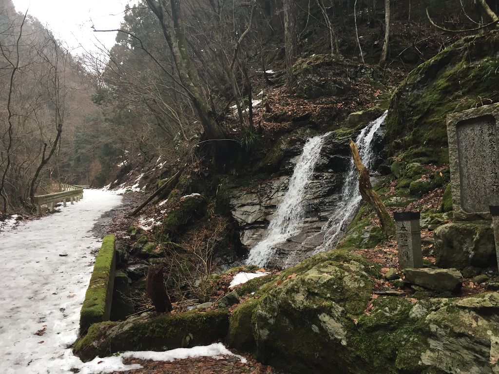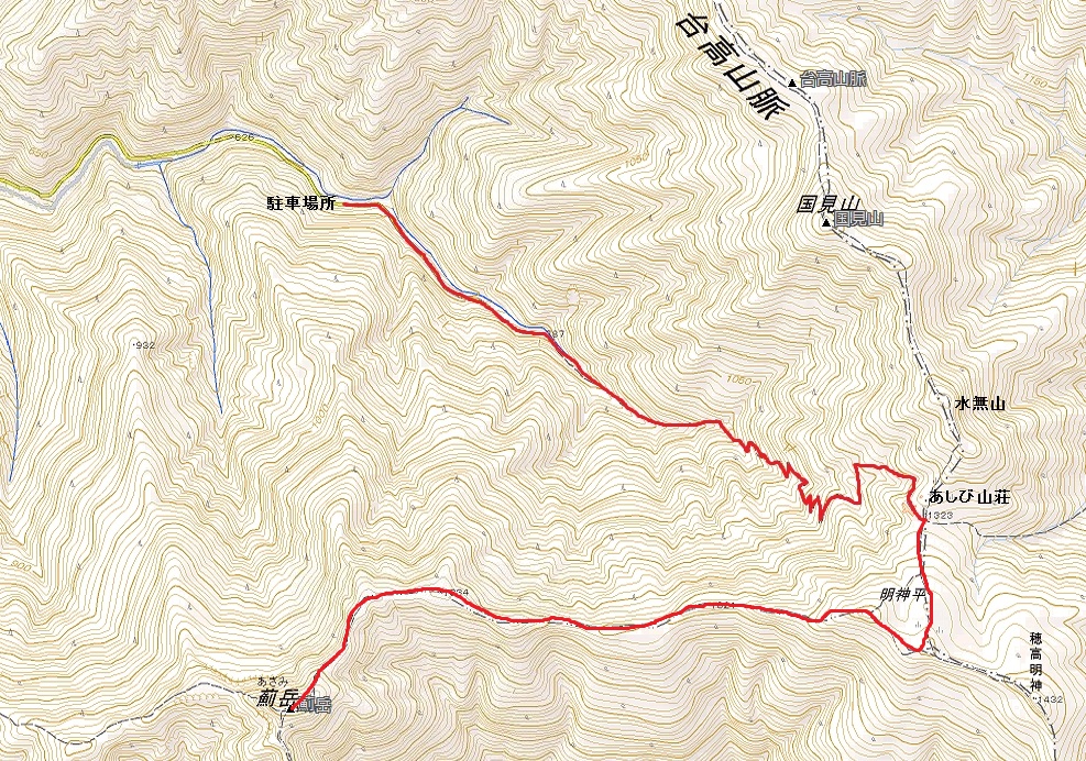 大又林道の駐車場→(15分)登山口→(60分)明神滝→(60分)明神平→(20分)前山→(60分)薊岳