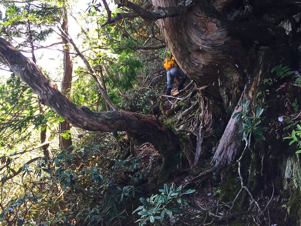 ここが最後の登りで一番キツかったところでした。ズルズル滑る急登。岩場の付近はルートが取りにくい。テープがあったので探しながら登ります