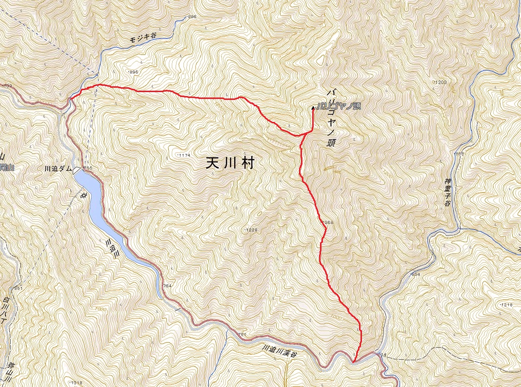 モジキ谷登山口→(3時間半)強力の頭→(30分)バリゴヤノ頭→下山開始→(2時間)P1368→(1時間20分)大川口