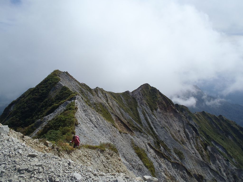下山時剣ヶ峰と稜線を振り返る。細尾根の下りは滑りそうで怖いがこれもストックあるとかなり安定した