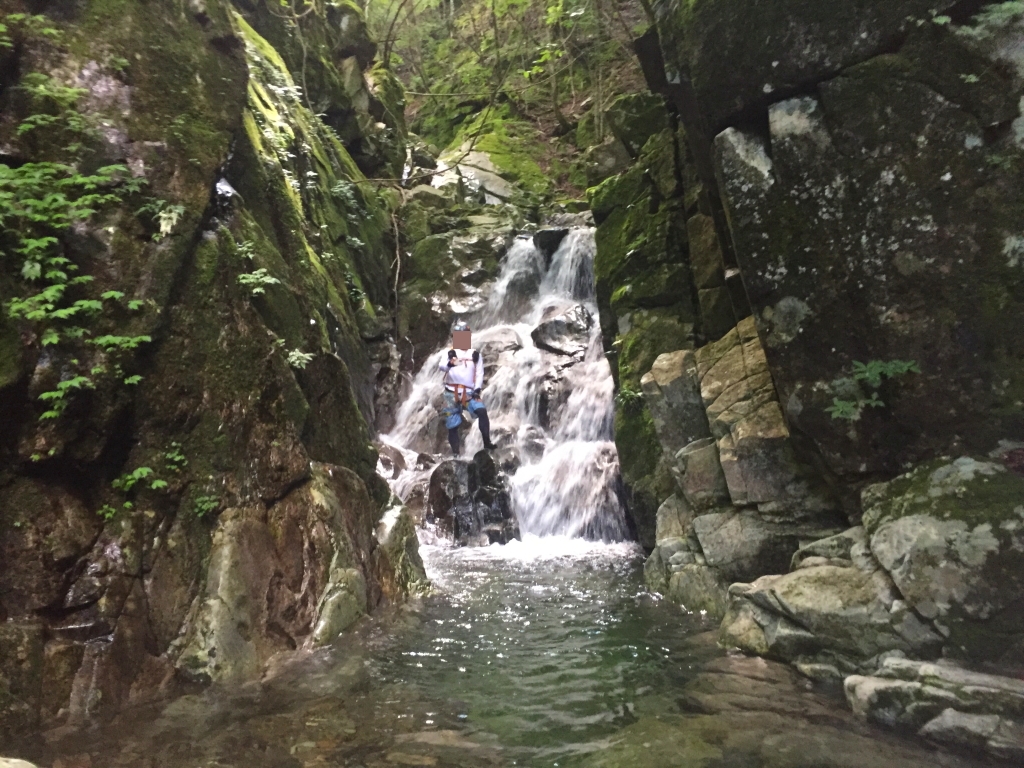 なかなかグッドな滝。本来ならここに飛び込んで登るが、今回は上半身濡れるとこまるので、これを巻きます