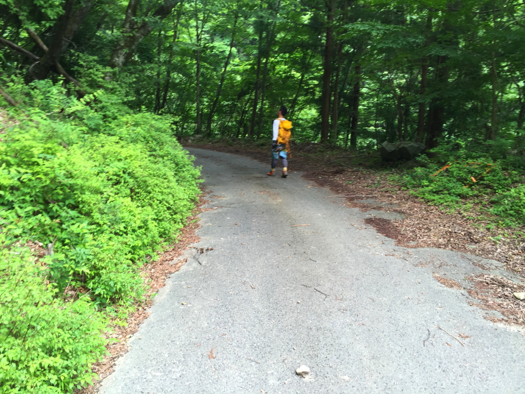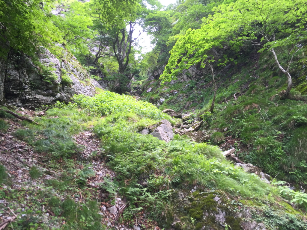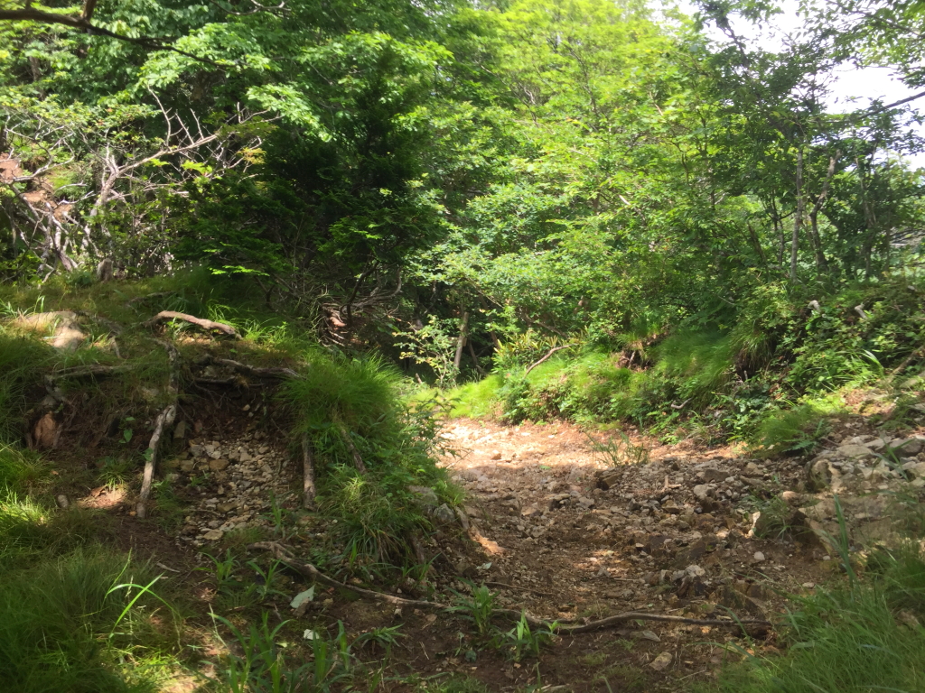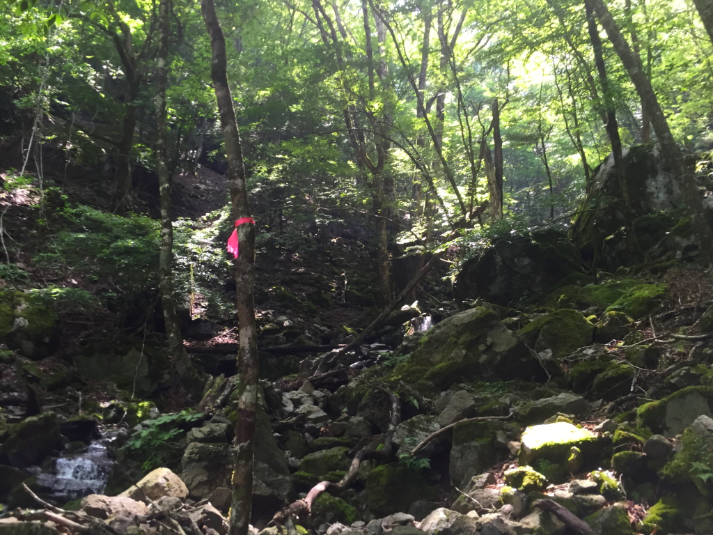 はぁはぁ息を切らしながらの急登。時間をかけてゆっくり登っていく。この後、右側に沢が見えてくるので沢のところを登る