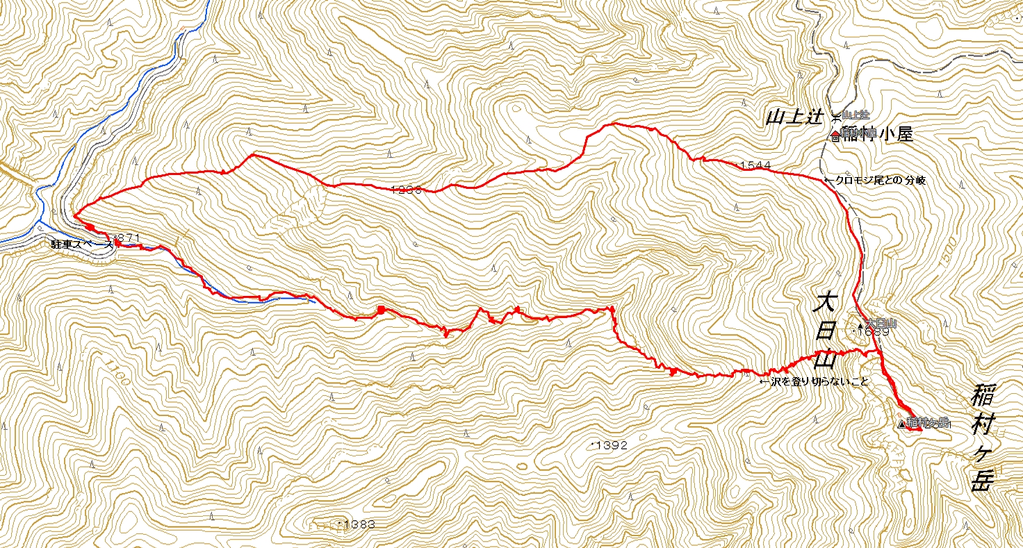 駐車スペース→(5分)入渓ポイント→(120分)遡行終了→(90分)大日キレット →(20分)稲村ヶ岳→(90分)クロモジ尾分岐 →(90分)林道→(5分)駐車スペース