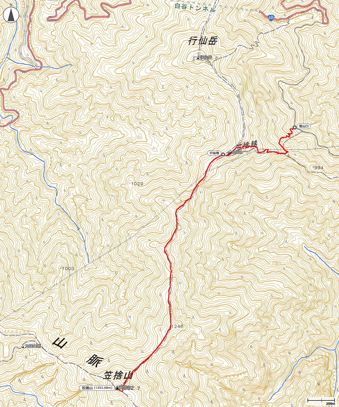 登山口→(40分)行仙宿→(100分)笠捨山 →(70分)行仙宿→(30分)登山口