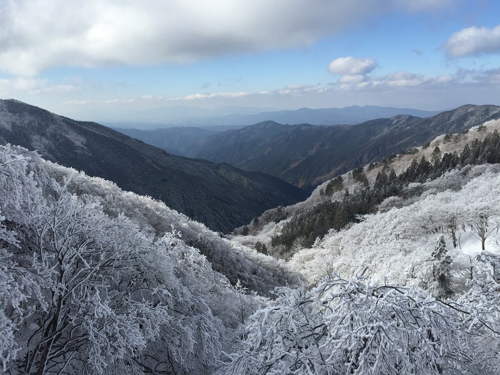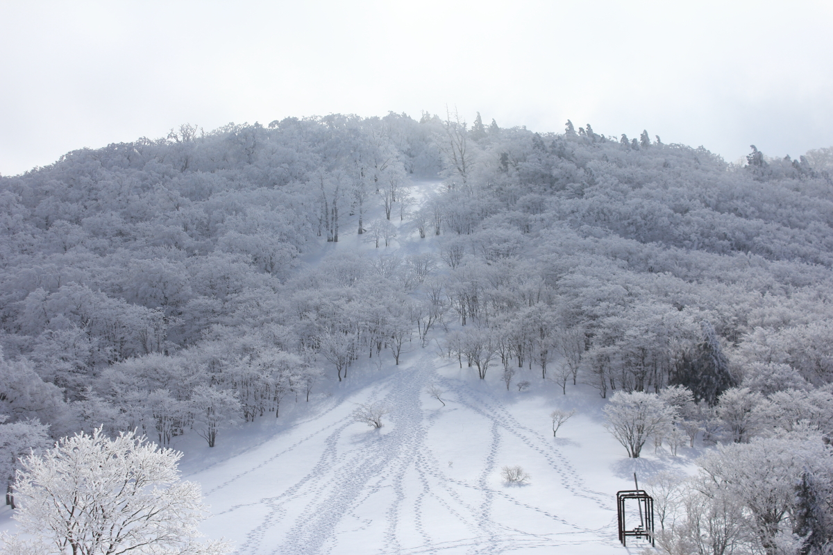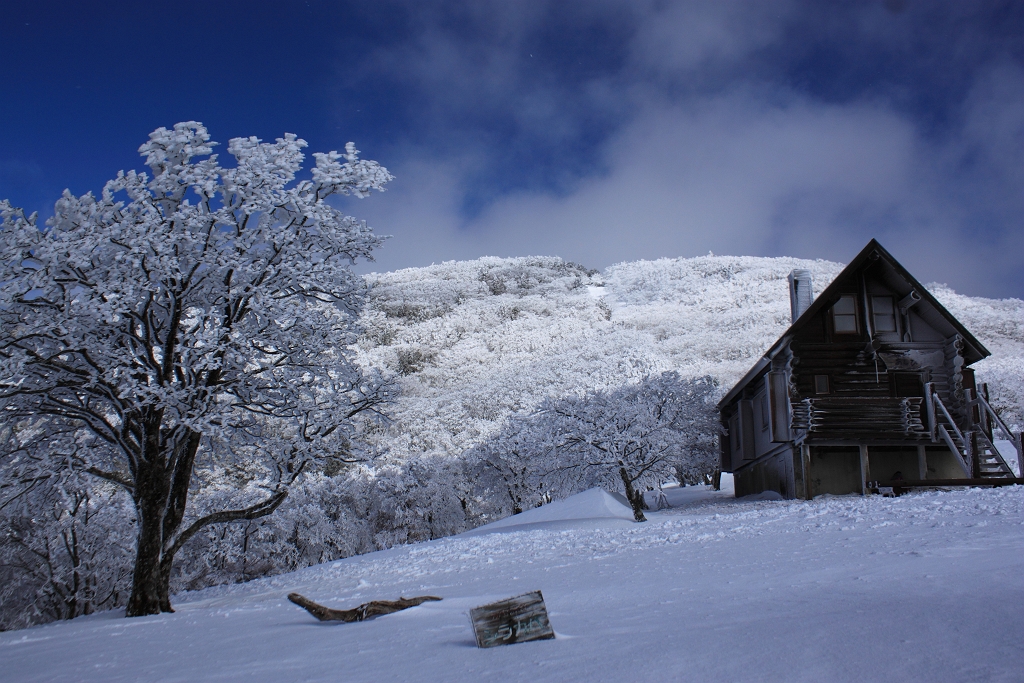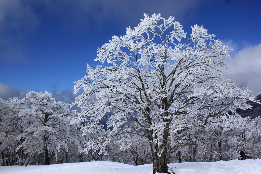明神平(みょうじんだいら) 台高山脈にある明神平の冬はまさに白銀の世界と化すが、いつもガスっている。 その中で晴れた日に行くと素晴らしい青と白のコントラストが望める