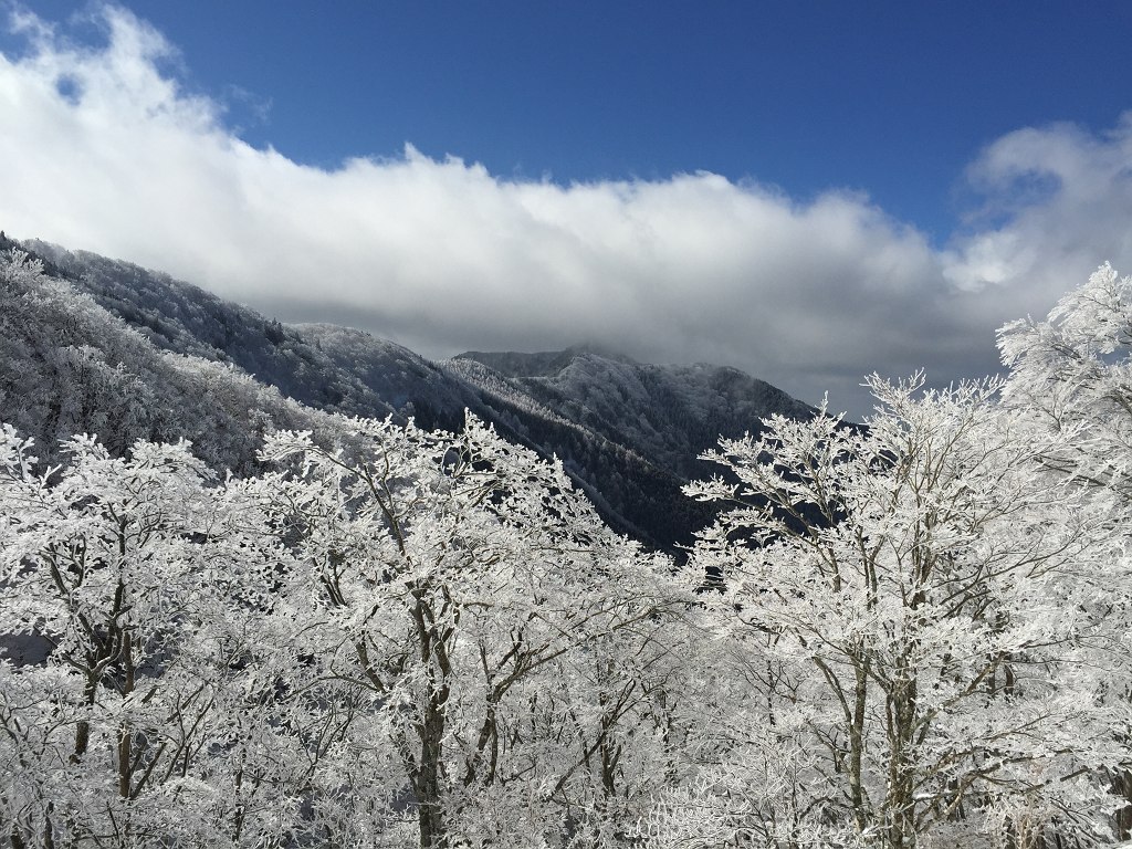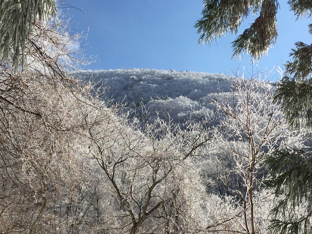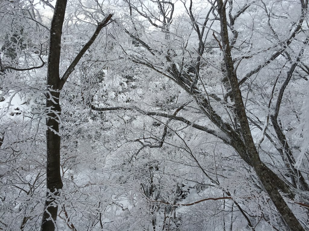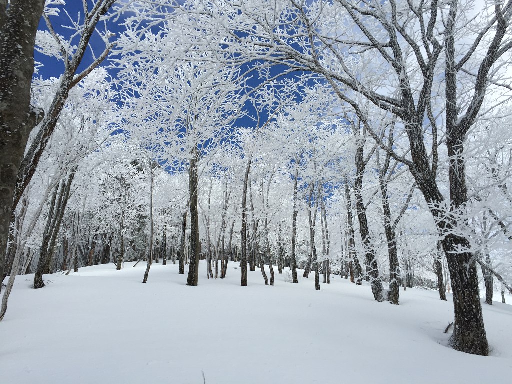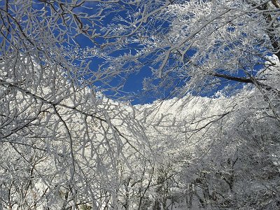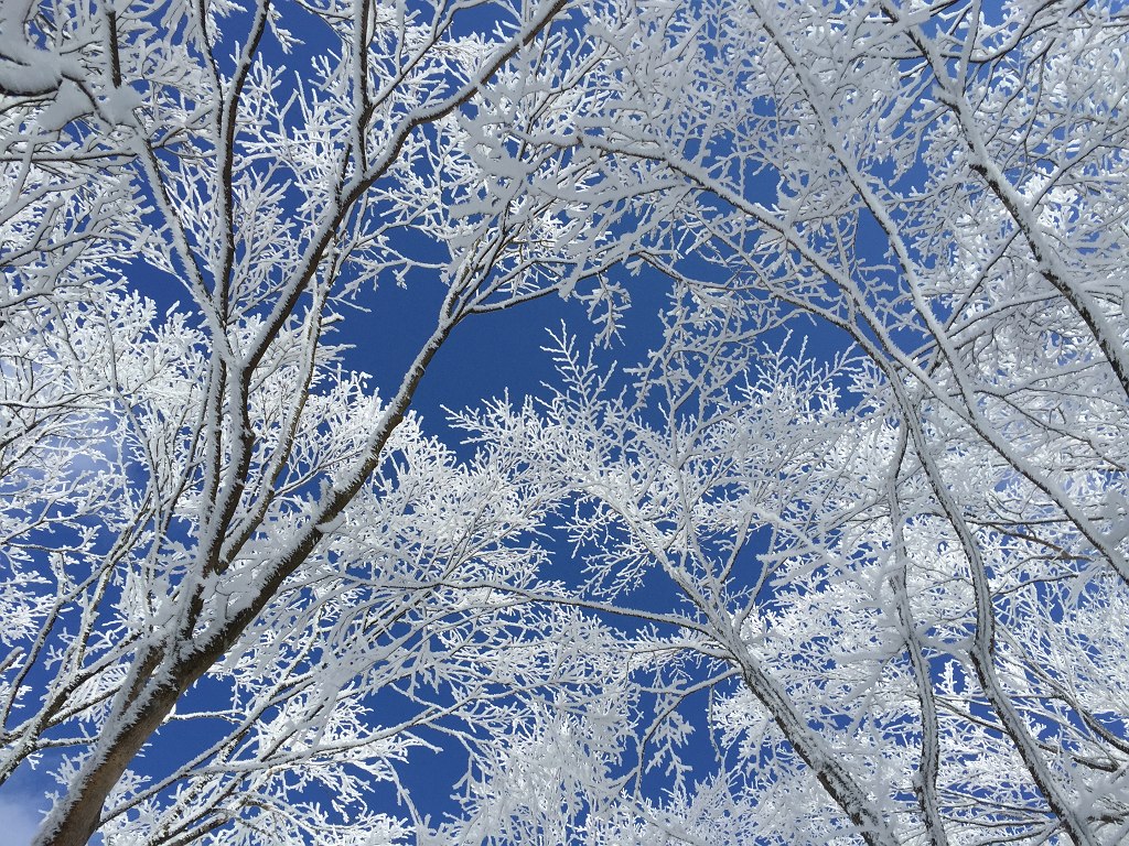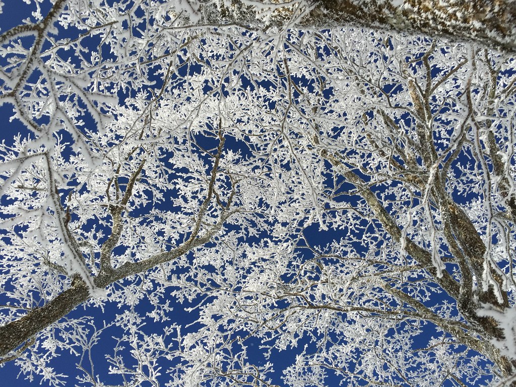 樹林帯の中で見上げると霧氷と空がコラボレーションする