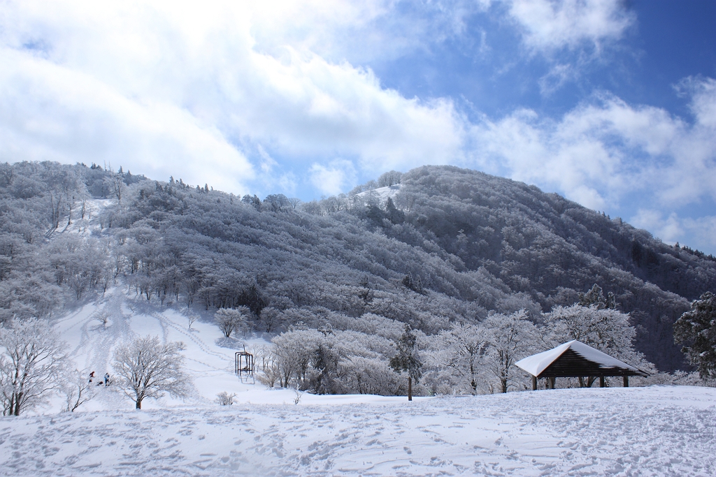 明神平に設置されているあしび山荘。積雪時には雪景色とコラボする