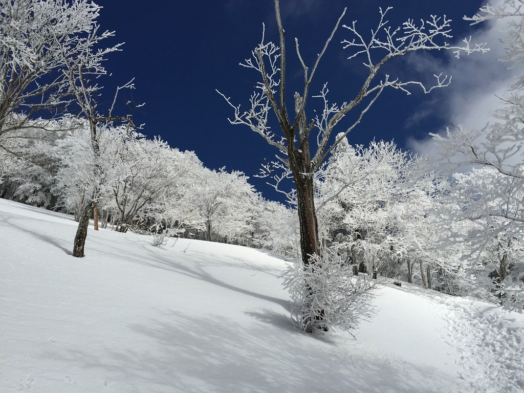 真っ青な空と新雪と霧氷はまさに青と白のコントラスト