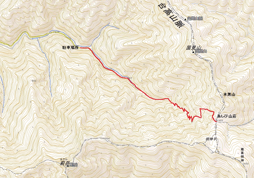 大又林道の駐車場→(10分)登山口→(130分)明神平