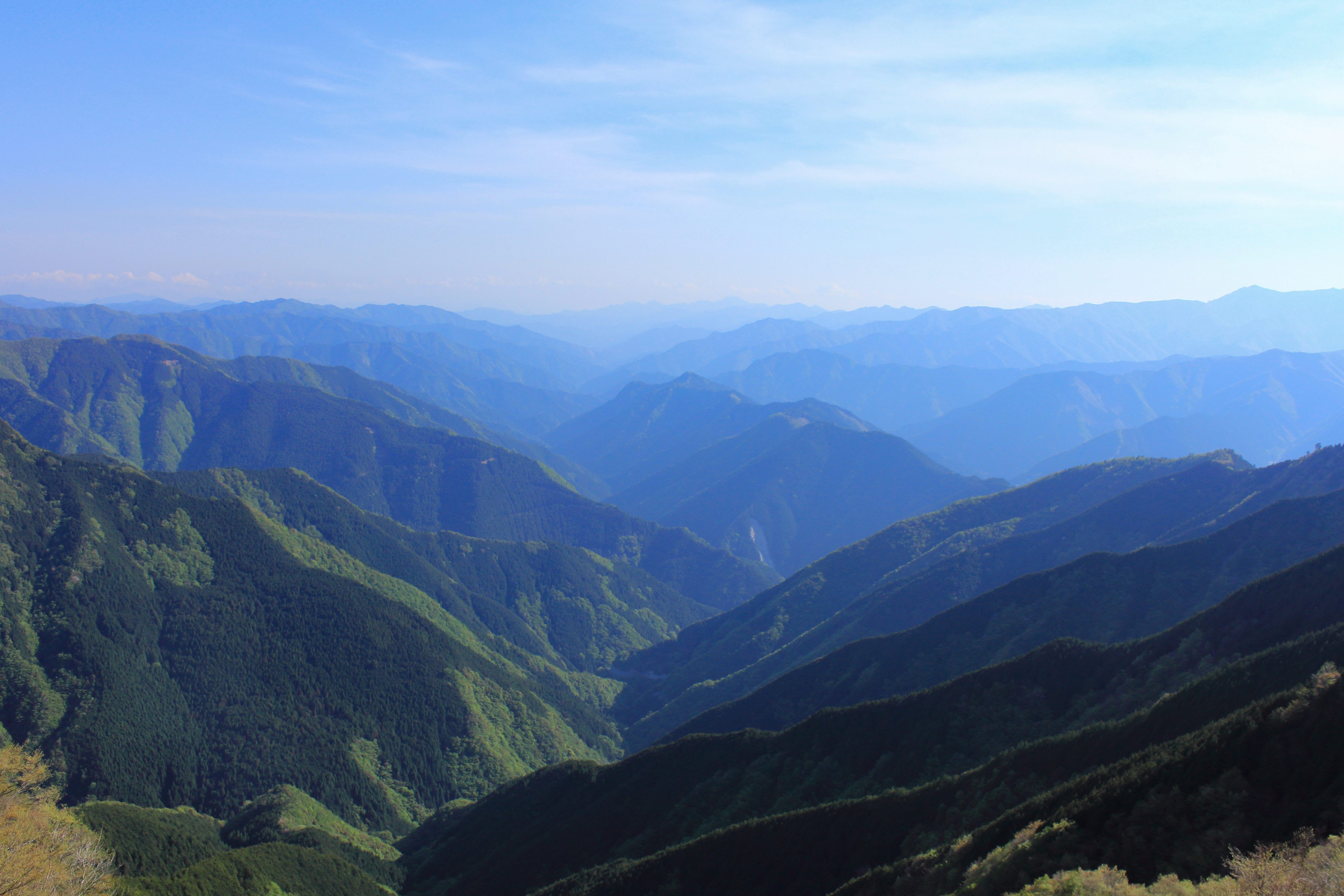 大台ヶ原ドライブウェイから南西側を望むと果てしなく続く山々がそびえたつ