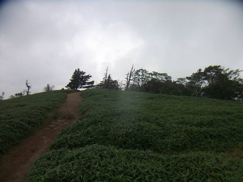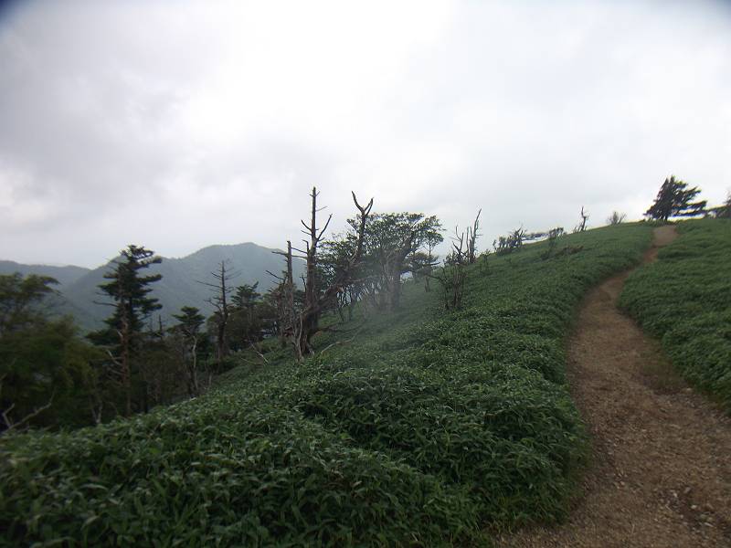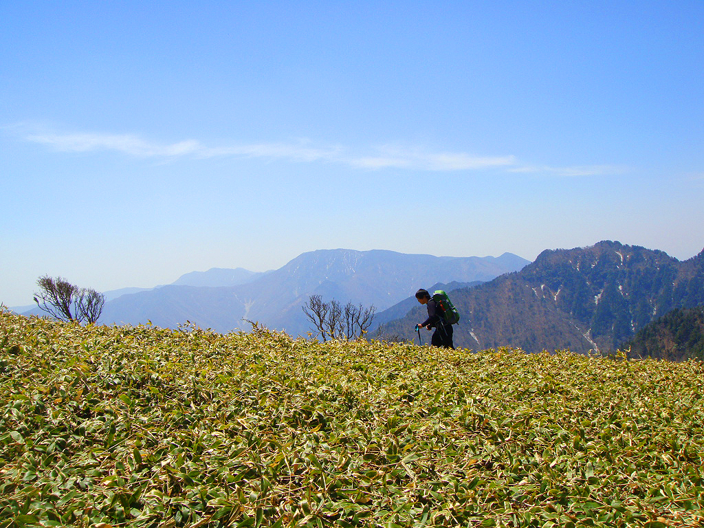 お花畑とは言えないが、頂上付近には笹地帯があり、その向こう側に迫力ある山々を望むことができる