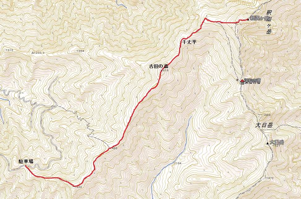 駐車場→(70分)古田の森→(20分)千丈平→(30分)釈迦ヶ岳