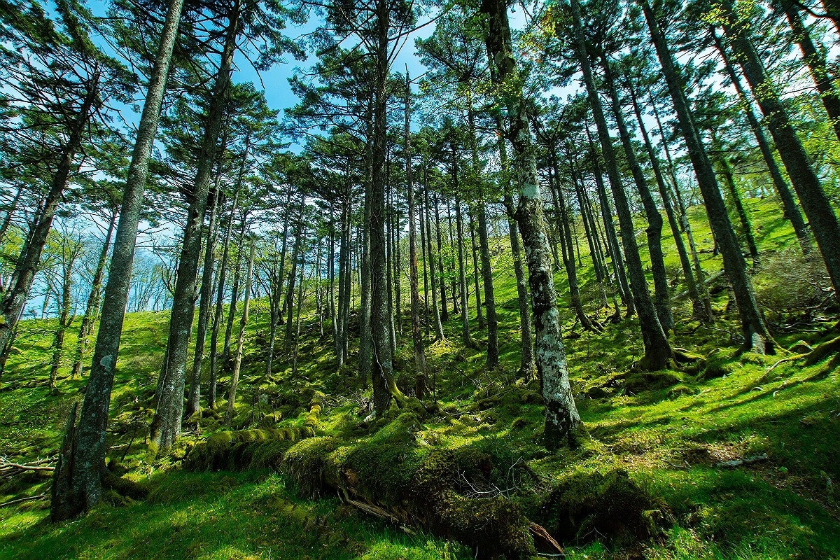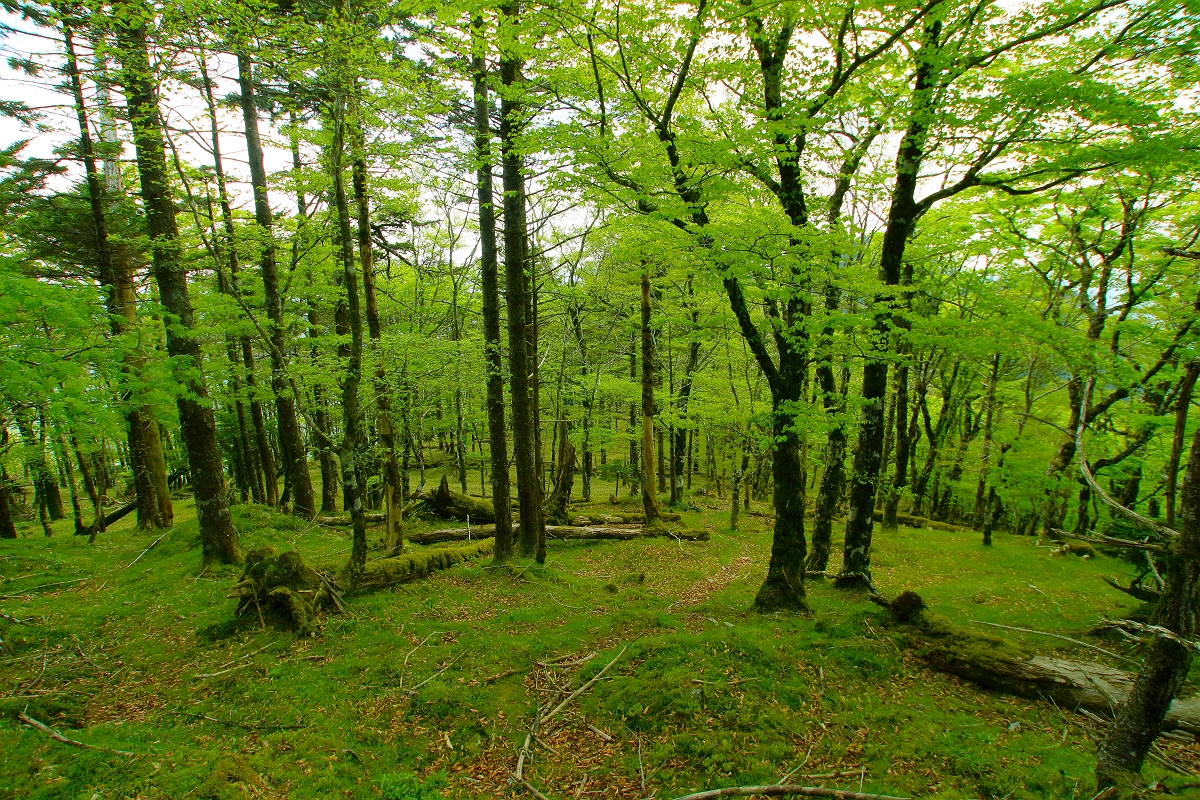 七面山頂上周辺の樹林帯の中には緑一面の場所も存在する