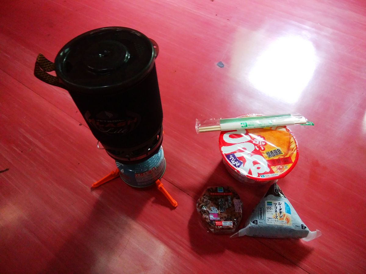 本日の昼食はこれ。いつも通りきつねうどんとおにぎりを食べる