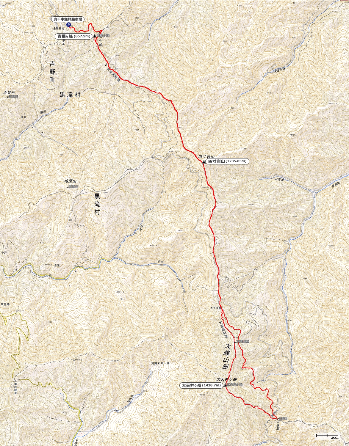 奥千本無料駐車場→(30分)青根ヶ峰→(90分)四寸岩山→(50分)百丁茶屋→(60分)大天井ヶ岳→(35分)五番関→(60分)百丁茶屋→(70分)四寸岩山→(70分)奥千本無料駐車場