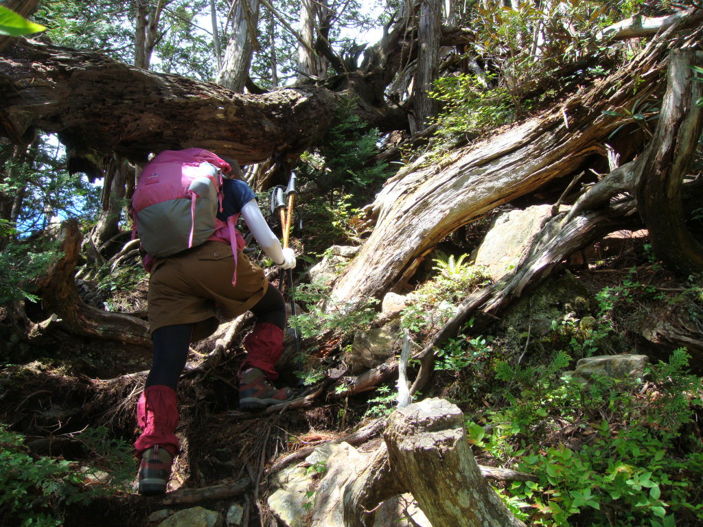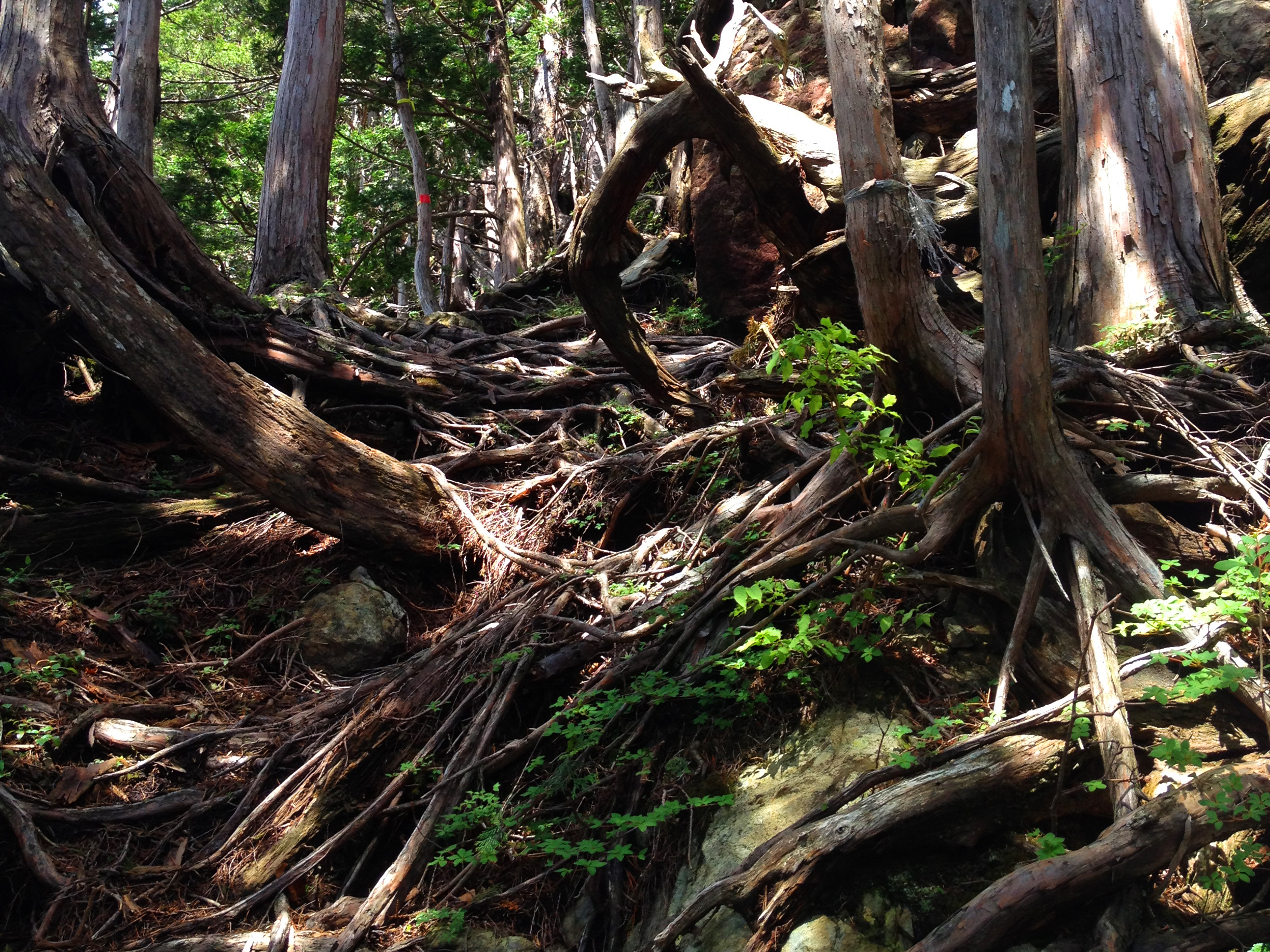 鉄山付近は倒木や根っこ地帯を歩く。何がなんだかわからないが自然が作り出した産物であることは間違いない