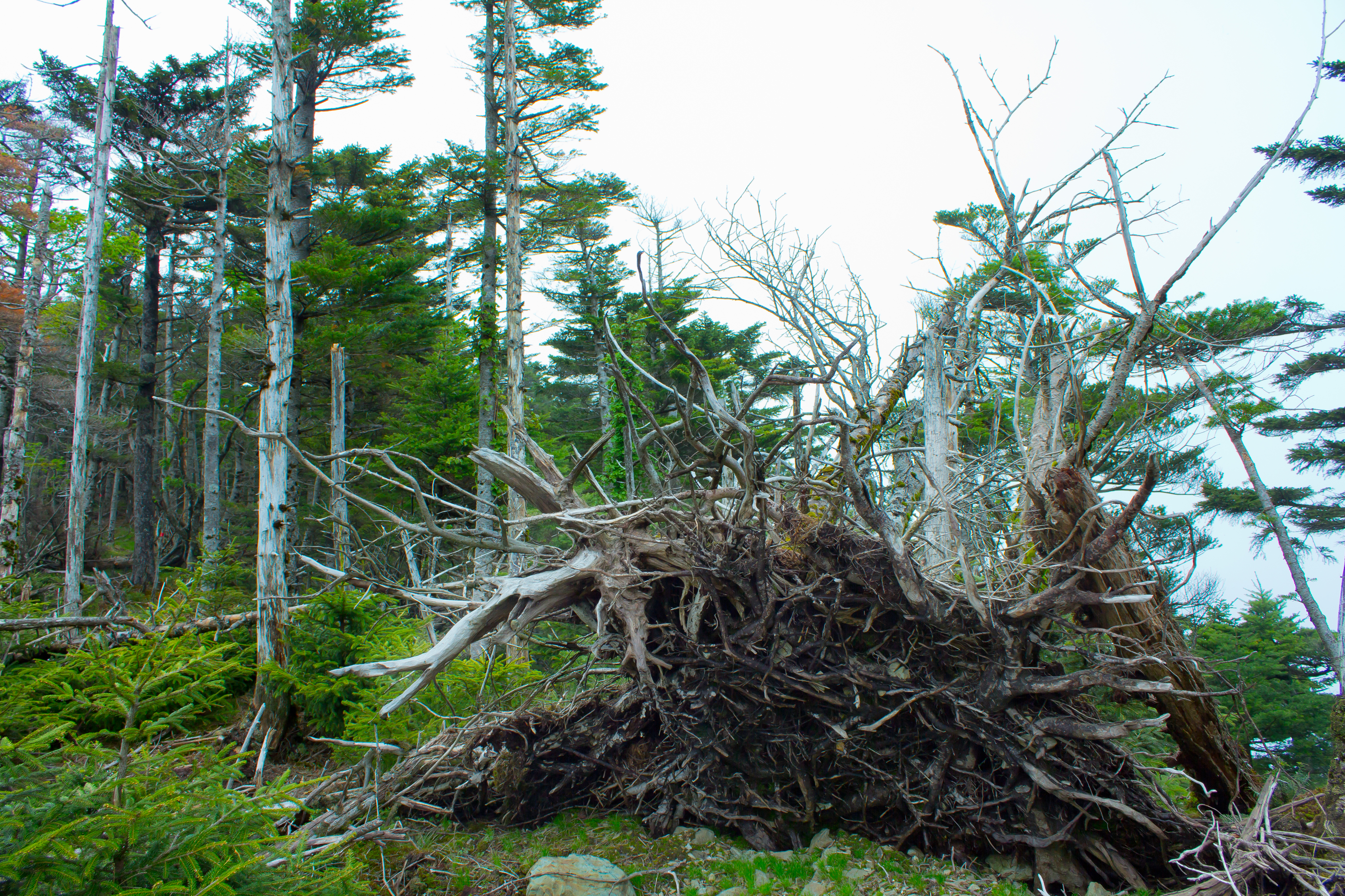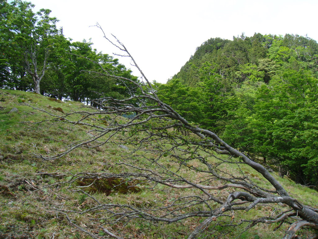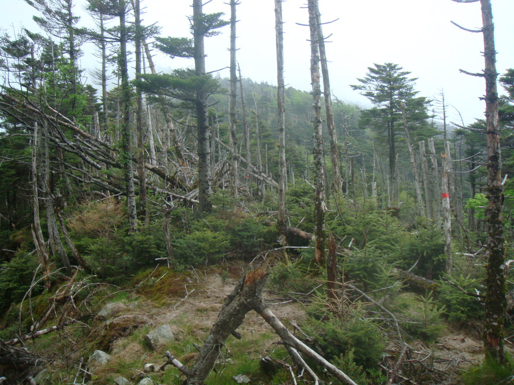 弥山の手前は倒木の枯れ木が散乱する大倒木地帯となっている。これも自然の作り出した産物といえる