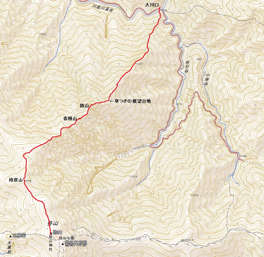 大川口→(110分)草つきの展望台地→(10分)鉄山→(10分)香精山→(70分)修復山→(30分)弥山