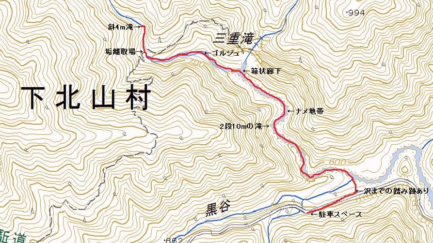 駐車場→(10分)北股川出合→(40分)二段10Mの滝→(60分)ゴルジュ→(20分)垢離取場→(5分)4m滝